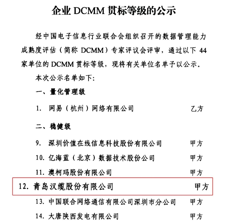 近日,經(jīng)過中國(guó)電子信息行業(yè)聯(lián)合會(huì)的審查和評(píng)估,青島漢纜股份有限公司順利通過了DCMM“穩(wěn)健級(jí)(3級(jí))”模型評(píng)估認(rèn)證。