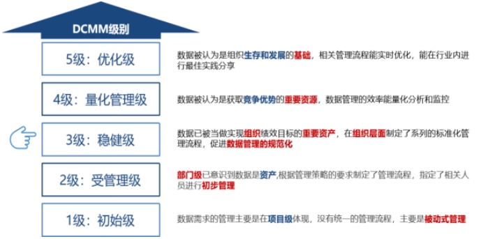 DCMM將數(shù)據(jù)管理能力成熟度劃分為五個(gè)等級(jí),自低向高依次為初始級(jí)(1級(jí))、受管理級(jí)(2級(jí))、穩(wěn)健級(jí)(3級(jí))、量化管理級(jí)(4級(jí))和優(yōu)化級(jí)(5級(jí)),不同等級(jí)代表企業(yè)數(shù)據(jù)管理和應(yīng)用的成熟度水平不同。