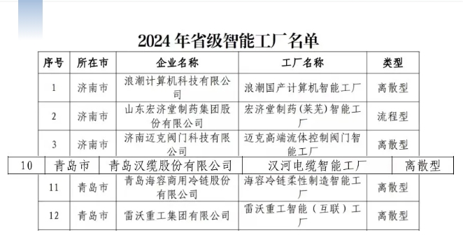 近日,山東省工業(yè)和信息化廳正式公布了2024年省級(jí)智能工廠、數(shù)字化車間、智能制造場(chǎng)景及智能制造系統(tǒng)解決方案供應(yīng)商的名單。經(jīng)過嚴(yán)格的申報(bào)、推薦及專家評(píng)審程序,青島漢纜股份有限公司憑借其卓越的智能制造實(shí)力和創(chuàng)新能力,成功入選省級(jí)智能工廠名單,標(biāo)志著公司在智能制造領(lǐng)域邁出了堅(jiān)實(shí)一步。
