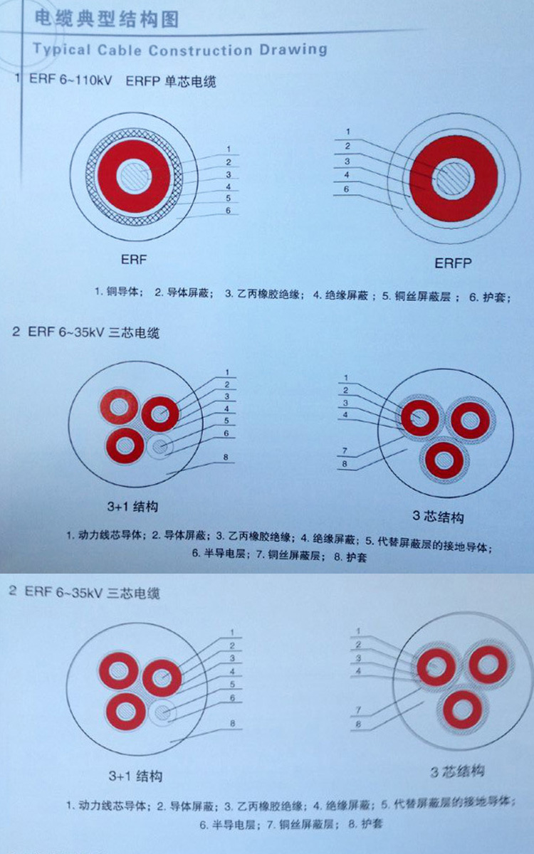 電壓等級:0.6/1KV 1.8/3KV 3.6/6KV 6/10KV 8.7/15KV 12/20KV 18/30KV 26/35KV 64/110KV